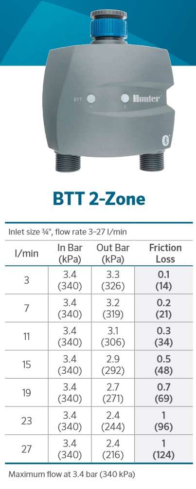 BTT — Bluetooth®, ar baterijām darbināms laistīšanas taimeris, ko kontrolē iOS vai Android viedtālruņa aplikācija. BTT ir ideāls, izturīgs iekštelpu un āra bezvadu risinājums, lai laistītu dārzus, siltumnīcas, terases, stādus podos, puķu dobes, stādaudzētavas un nelielas zāliena platības, kas atrodas vietās, kurās nav pieejama pazemes apūdeņošana.